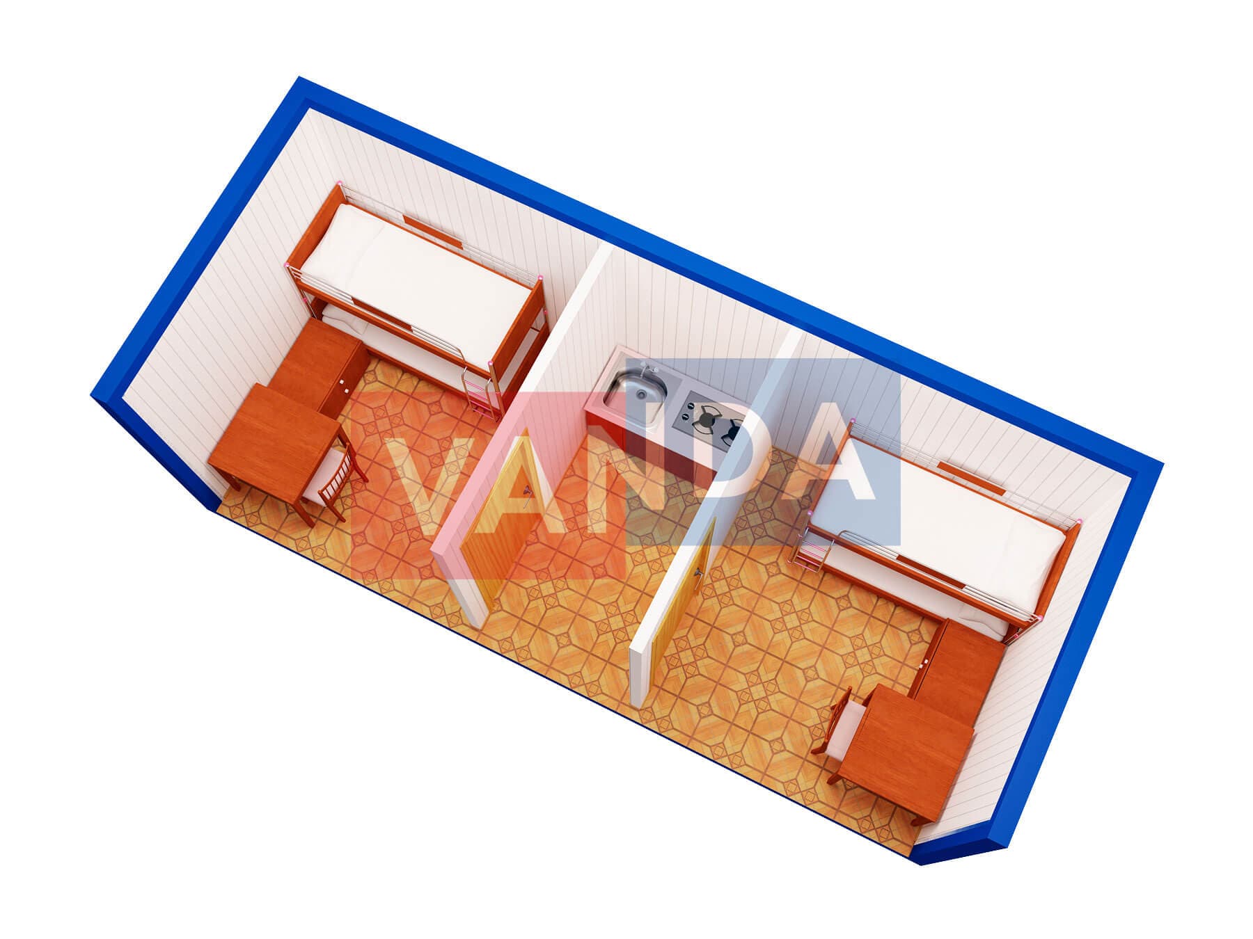 Блок контейнер металлический распашонка 5,85х2,4 изготавливается из несущего каркаса (верхняя и нижняя обвязка): швеллер 100х50х3 мм., угловые стойки: сложно - гнутый угол 90х90х3 мм., крыша блок-контейнера: металл сварной 0,9-1 мм., качественная наружная отделка: оцинкованный профлист, внутренняя отделка стен: Вагонка ПВХ, внутренняя отделка потолка: Вагонка ПВХ, вспомогательный деревянный каркас (стены): брусок 40х75 мм., лаги пола: обрезная доска 40х100 мм., лаги потолка: обрезная доска 40х100 мм., выполнено утепление: Минеральная вата «ISOVER» – 50 мм. и пароизоляция: плёнка техническая, черновой пол состоит из: обрезная доска 20 мм. (2 сорт), чистовой пол покрыт: ДСП строительное 16 мм., отделка пола выполнена из качественных материалов. Контейнер комплектуется окнами: деревянное, двойное остекление 800х1000, входной дверью: ДГ 21-8 обшита снаружи оцинкованным листом, врезной замок и внутренними дверями: ДГ 21-8 (при наличии перегородки). Если в БК присутствуют перегородки, то для них используется: брусок 40х50 мм.